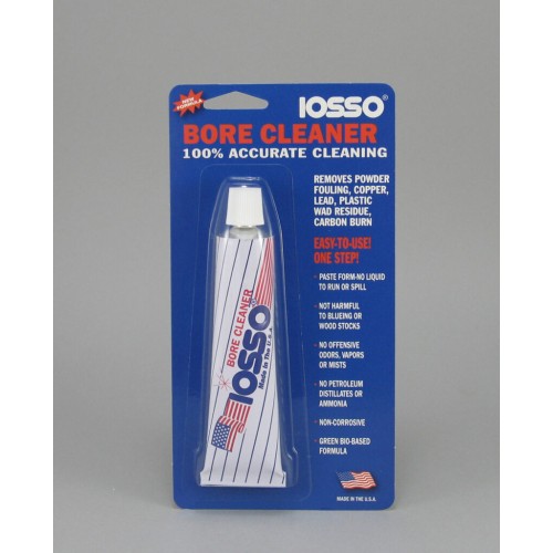 NEW BIO-Based Formula. Highly effective concentrated paste formula that lasts longer and takes less time to clean with than ordinary liquid or aerosol type cleaners. Because it is a paste it cannot spill or run into wood stocks, grips or mechanisms causing chemical damage. Iosso Bore Cleaner removes copper, lead, carbon burn, powder fouling, plastic wad residue, and surface rust. It is non-corrosive, non-flammable and has no offensive odors or mists